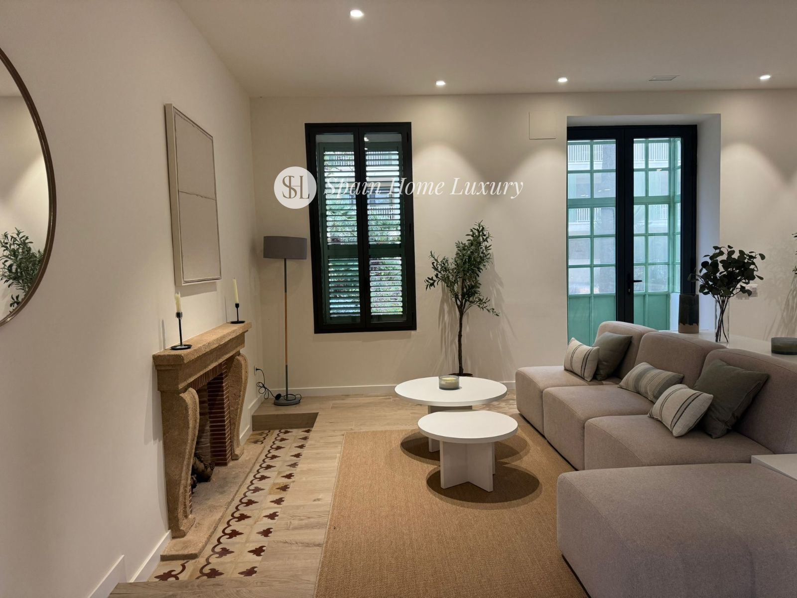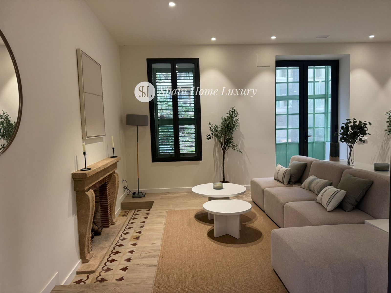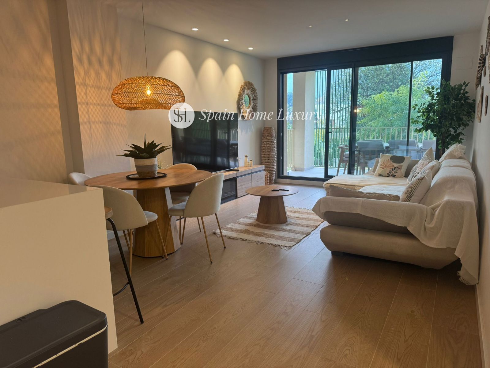a comfortable living-dining room opening onto a sunny terrace,