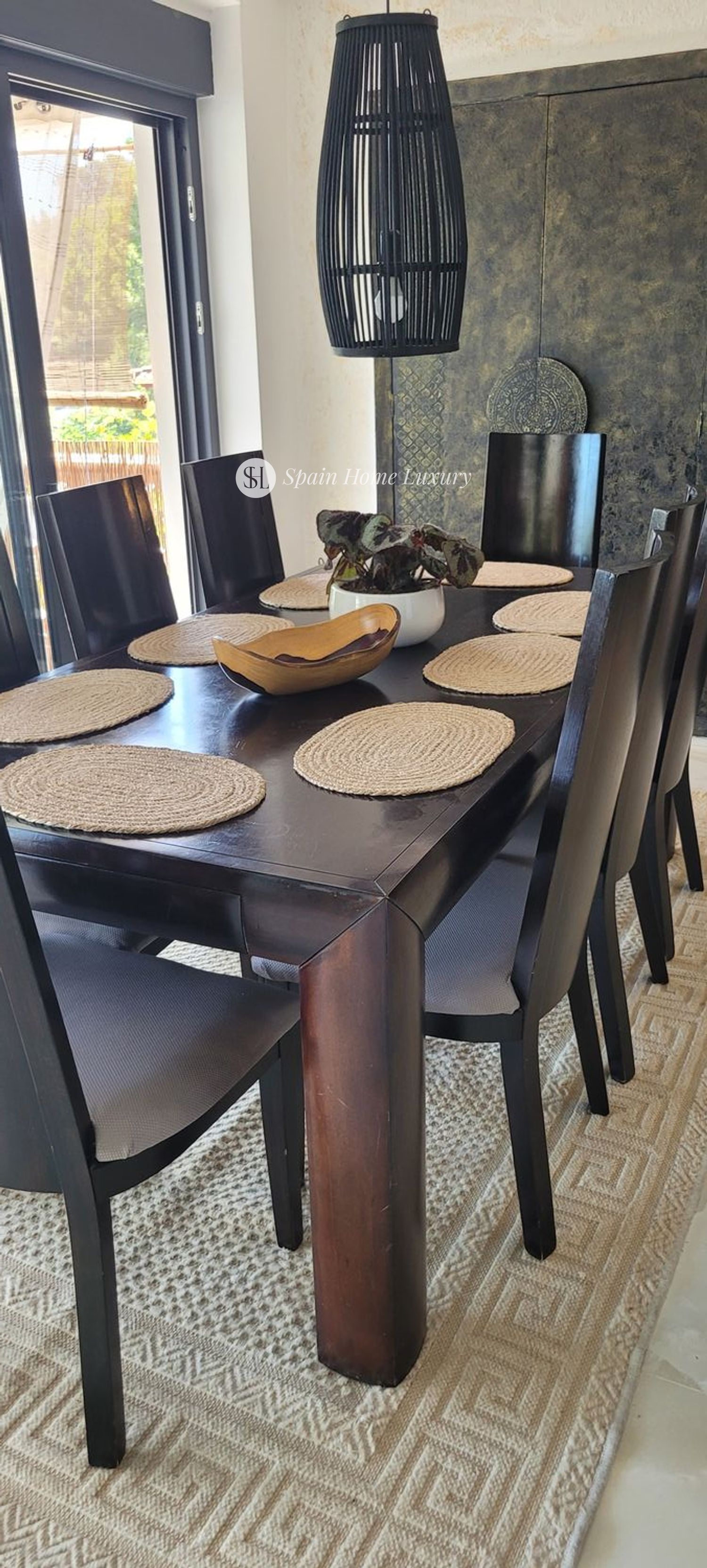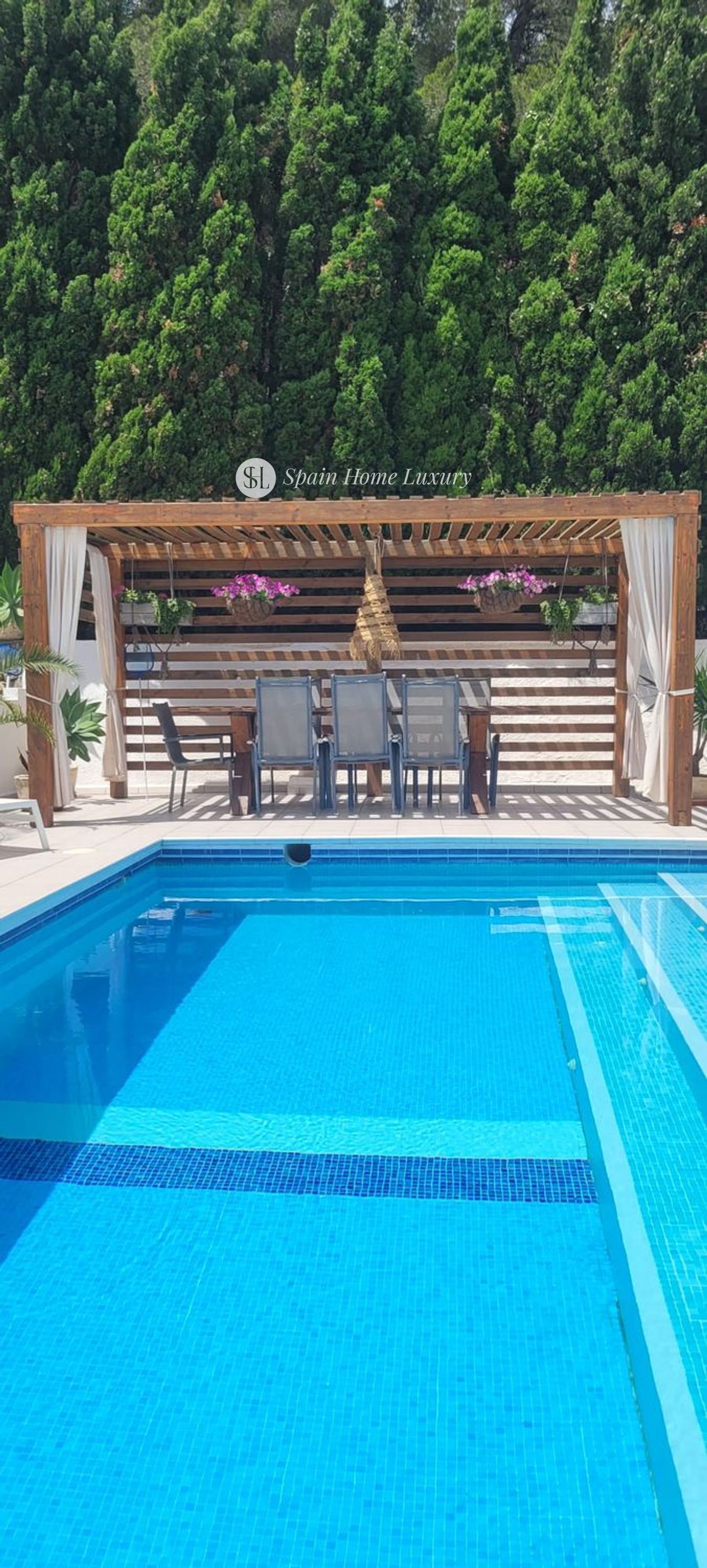 En la zona de la piscina te esperan cómodas tumbonas y una elegante pérgola de madera con una gran mesa: el escenario perfecto para celebrar inolvidables veladas de verano.