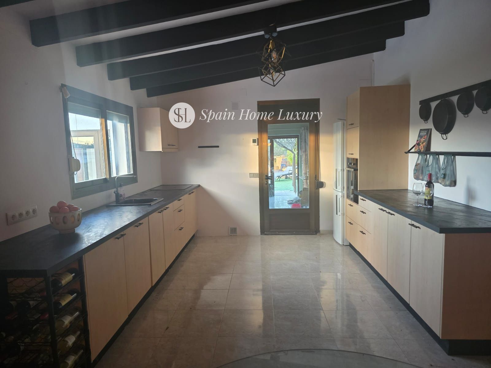 Casa principal con tres amplios dormitorios, dos baños completos, cocina equipada y un gran salón-comedor con chimenea.