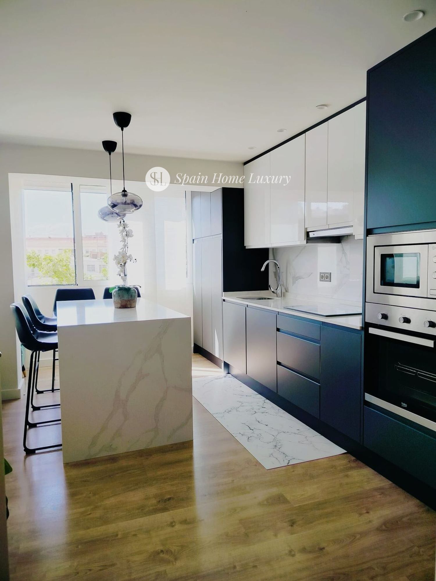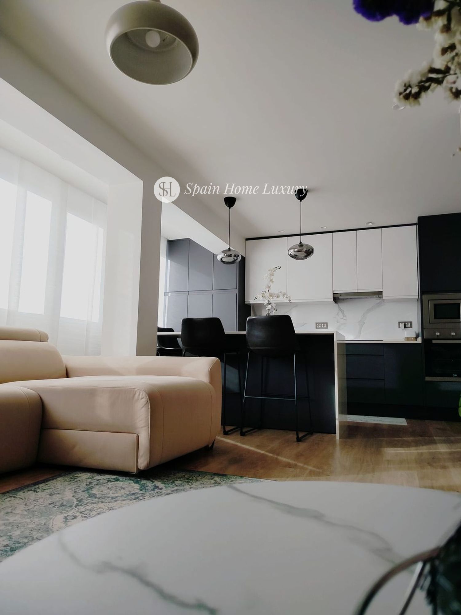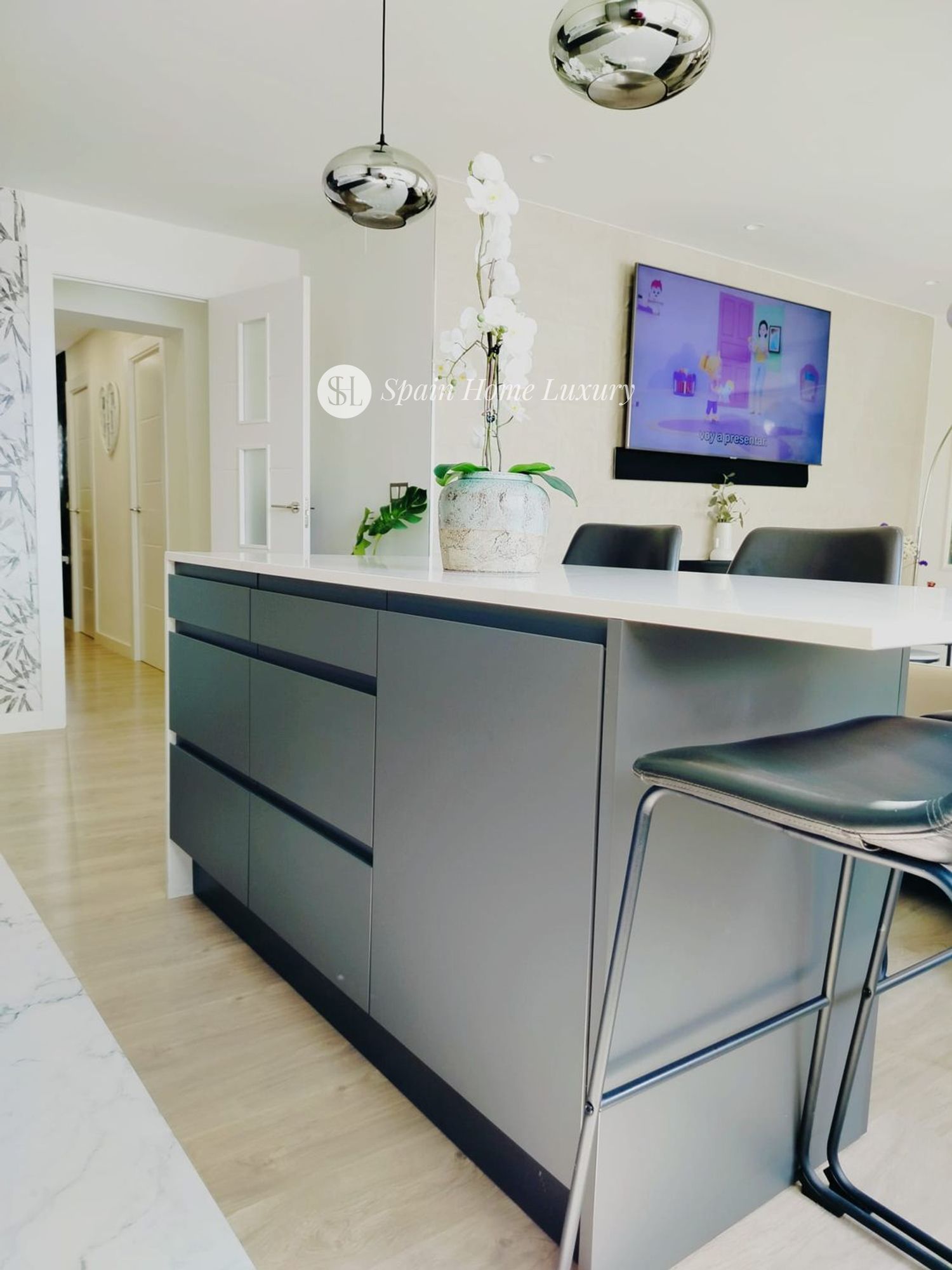 Le spacieux hall d’entrée mène à une élégante cuisine américaine avec îlot central en silestone et branchements électriques intégrés, entièrement équipée avec des électroménagers modernes (lave-vaisselle, lave-linge séchant, four, micro-ondes, réfrigérateur). Le salon, baigné de lumière grâce à ses grandes baies vitrées, comprend un canapé-lit électrique motorisé pour un confort optimal.
