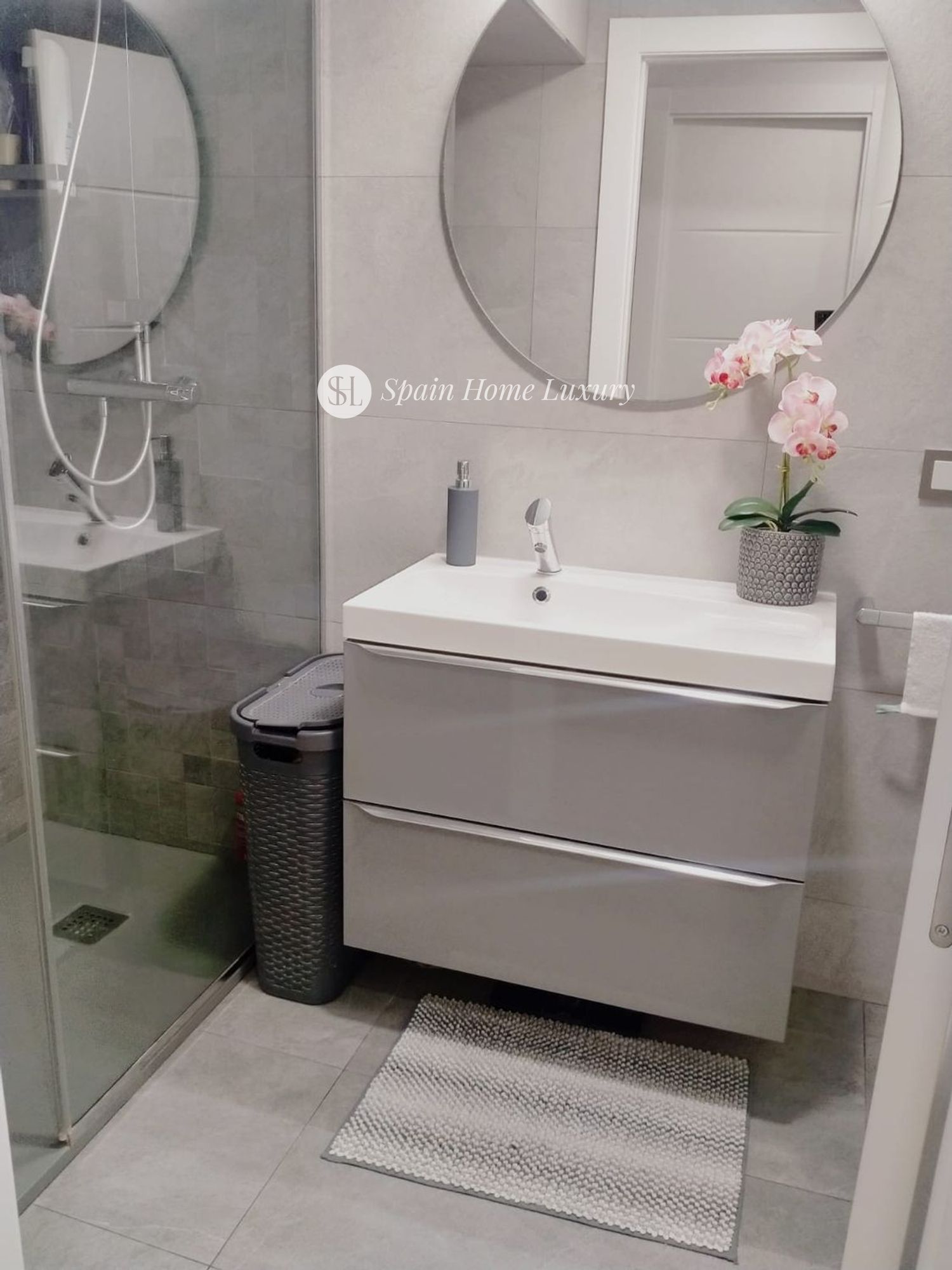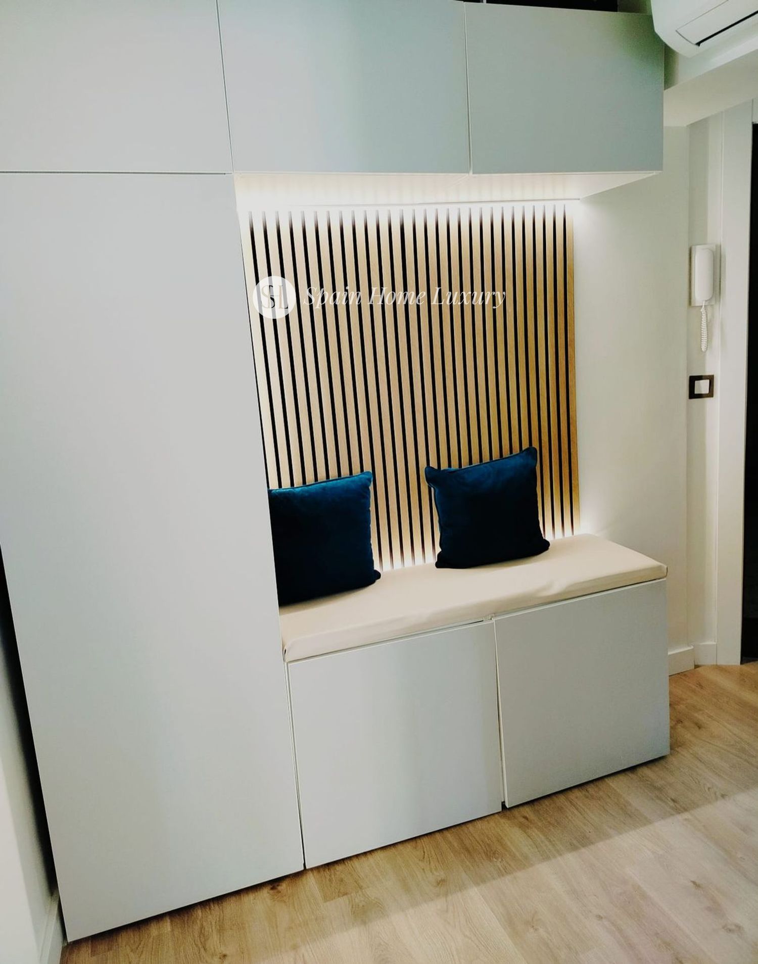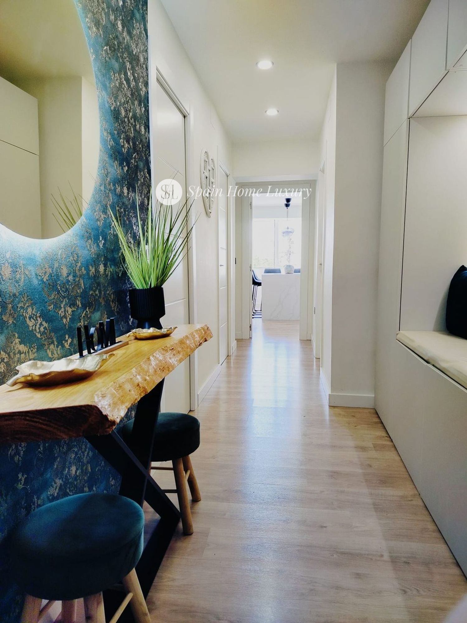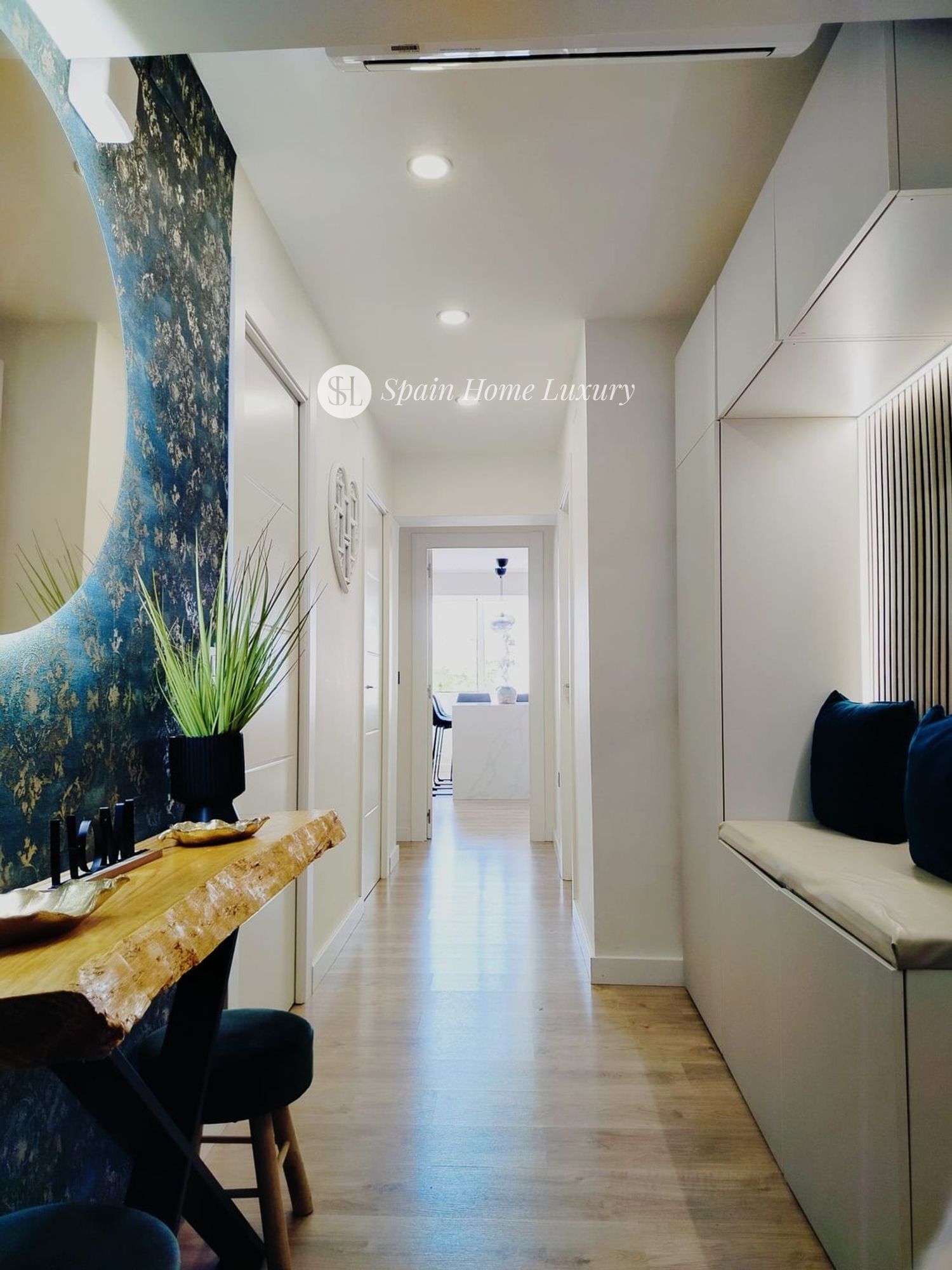 Le spacieux hall d’entrée mène à une élégante cuisine américaine avec îlot central en silestone et branchements électriques intégrés, entièrement équipée avec des électroménagers modernes (lave-vaisselle, lave-linge séchant, four, micro-ondes, réfrigérateur). Le salon, baigné de lumière grâce à ses grandes baies vitrées, comprend un canapé-lit électrique motorisé pour un confort optimal.